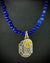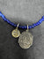 This necklace is hand-strung with deep cobalt blue beads, chosen for their saturated color and steady rhythm. At the center hangs a sterling silver Mary medal with a small vintage born Mary round medal. The imagery is softened through wear, the edges worn smooth—like something kept close for years.
