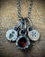 Two bronze coin medals—formed from hand-taken wax impressions of historical motifs—are hand-distressed and softened, bearing irregular edges and worn surfaces. A faceted garnet, set in oxidized sterling silver, sits at the center: dark, saturated, and quietly powerful.