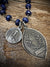Strung on faceted lapis lazuli beads hand-wired in oxidized sterling, the necklace has a striking presence. The lapis — a stone of truth, intuition, and ancient royalty — adds depth and richness that pairs beautifully with the darkened patina of the medals.