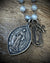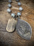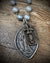Strung on luminous grey pearls hand-wired in oxidized sterling, the necklace has a softness that contrasts beautifully with the rugged, timeworn medals. Pearls bring intuition, grounding, and feminine strength — the perfect counterpart to the protective symbolism of Benedict and Lourdes.